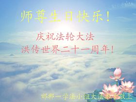 在普天同慶世界法輪大法的日子裏,我們學法小組大法弟子衷心祝願慈悲偉大的師父生日快樂!在正法即將結束的時刻,我們一定學好法,做好三件事,跟師尊早日回家。