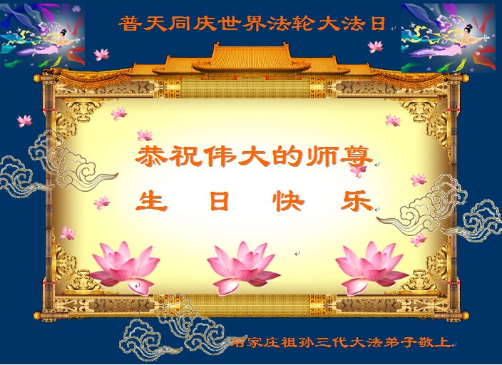 河北省石家莊祖孫三代大法弟子恭祝偉大的師尊生日快樂!普天同慶世界法輪大法日!