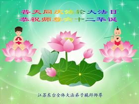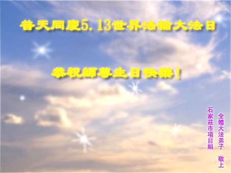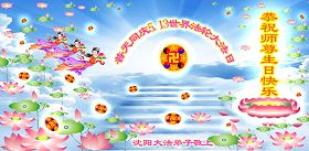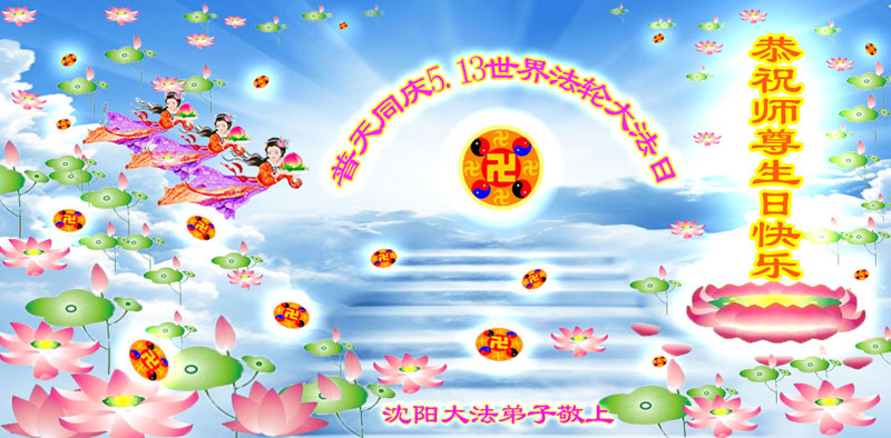 我們瀋陽市蘇家屯區全體大法弟子共同祝賀2013年世界法輪大法日的到來!全體大法弟子跪拜慈悲的師尊壽誕快樂。