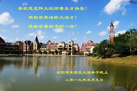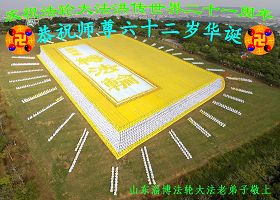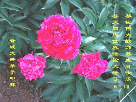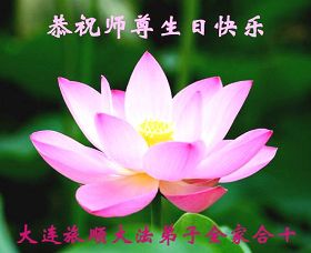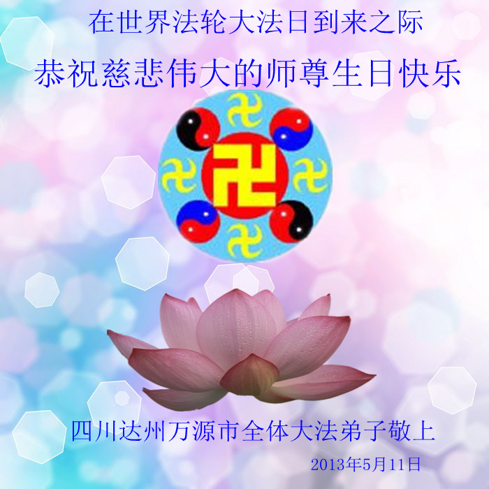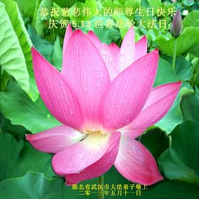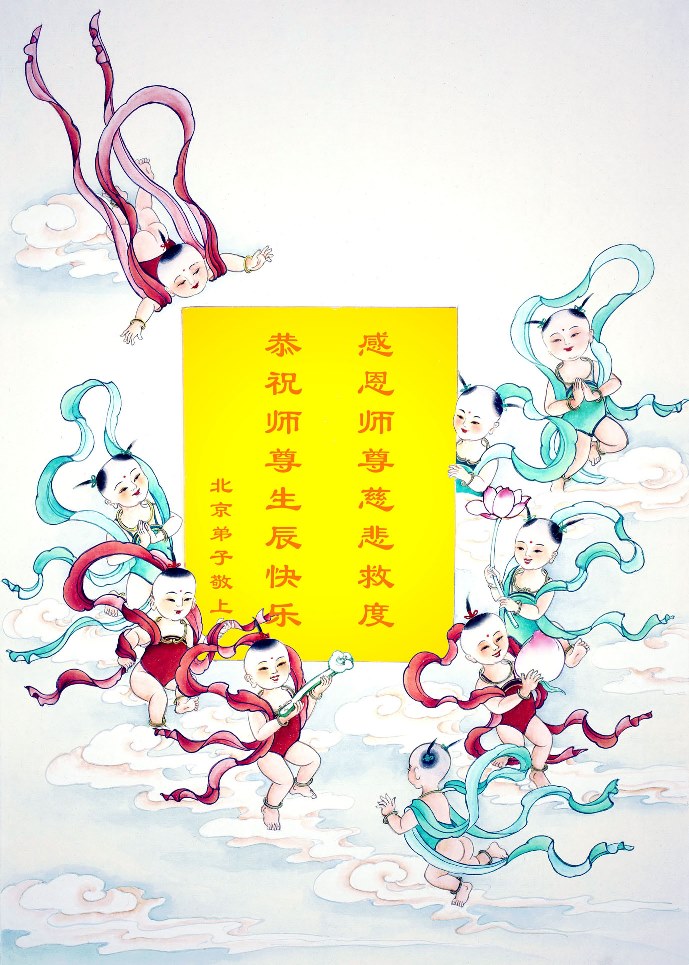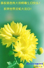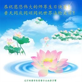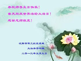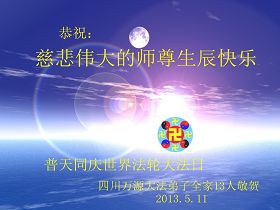 我們叩拜最偉大的師尊:您給予我們最最珍貴的大法、您給予我們許許多多甚至我們自己都不知道的一切;您為我們承受了數不盡的痛苦,您為我們開創了未來的世界。用盡人類的語言都無法表達我們對您的敬仰,竭盡眾生的智慧也不知如何對您感恩。最偉大的主啊,竟然下到人間救度我們……。師父啊,在這偉大、光輝的日子裏,我們向您獻上我們最誠摯的心!