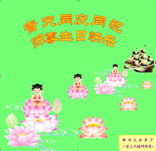 在這個特別的日子裏,普天同慶法輪大法日,作為弟子叩謝師恩慈悲苦度!對師尊時時刻刻的呵護無盡的感激!在此我們全家人恭祝師尊生日快樂!