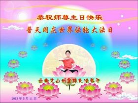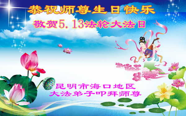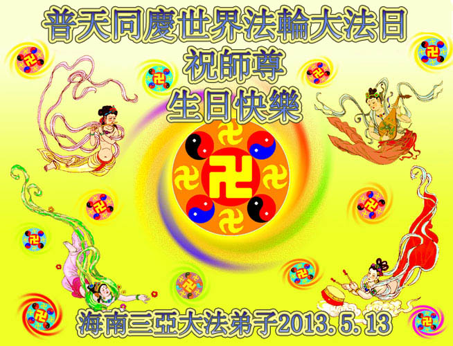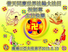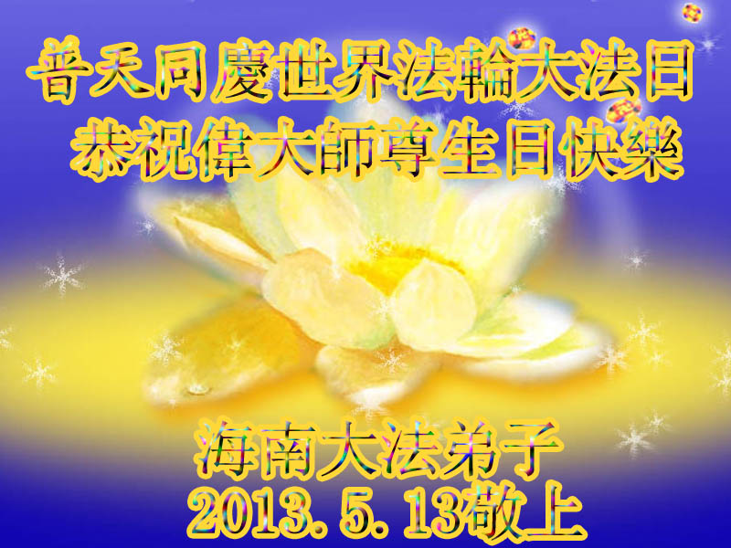 在這普天同慶的日子裏,海南大法弟子與全世界大法弟子一起慶賀這偉大而神聖的節日─5.13世界法輪大法日!同時恭祝慈悲偉大的師尊生日快樂!感恩師尊的慈悲苦度!
