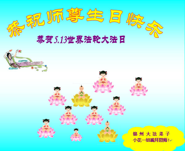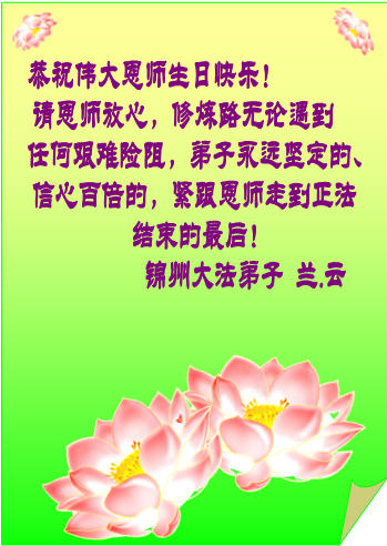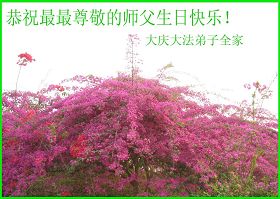 由於弟子沒有按照師父的要求做好,深感愧疚,讓師父您多操心了。今後一定要按照師父說的做好三件事,多救人,完成自己的史前大願,跟隨師父回家。在此祝師父生日快樂!