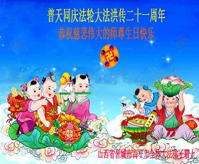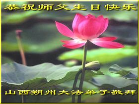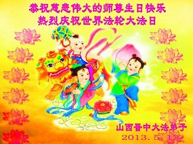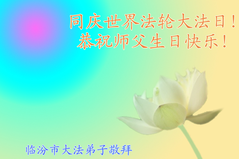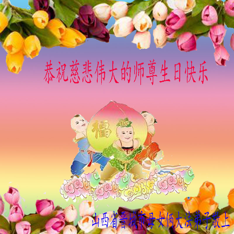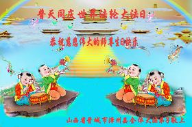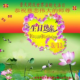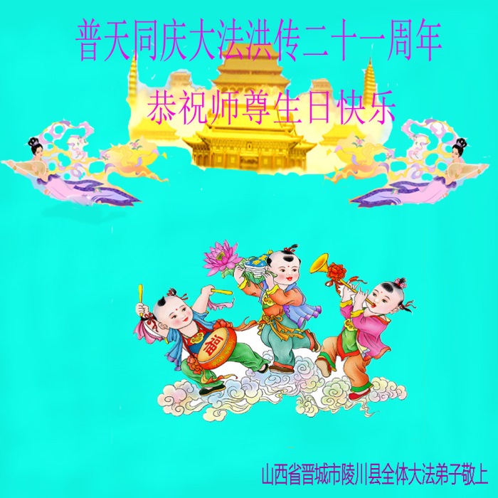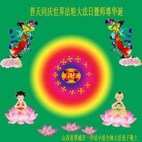 值此慈悲偉大的師尊六十二華誕暨普天同慶第十四屆「世界法輪大法日」到來之際,山西省晉城市全體大法弟子恭祝師尊生日快樂!請師尊放心,在這正法的最後時刻我們一定會緊跟師尊的正法進程,更加努力的做好三件事。學好法,向內修,向內找,增強凝聚力,形成一個強大的整體,不斷的精進。不辜負師尊的慈悲苦度,完成我們的史前大願,圓滿隨師還。