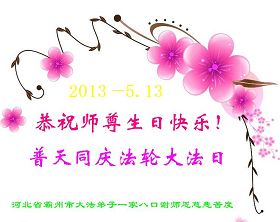 二零一三年五月十三日是第十四屆世界法輪大法日,也是慈悲偉大師父的六十二華誕。在這個天上人間共慶的日子裏,我代表我們全家以最最誠摯和崇敬的心情祝師父生日快樂,並叩拜偉大的師尊:一拜師父救命之恩;二拜師父教我做好人,返本歸真;三拜師父慈悲呵護,使我平坦的走在神的路上。