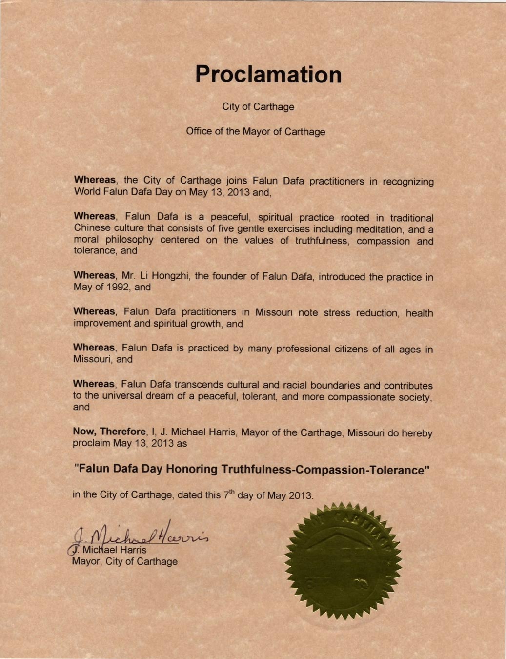 鑑於,迦太基市和法輪大法修煉者們一起慶祝二零一三年五月十三日的世界法輪大法日,並且