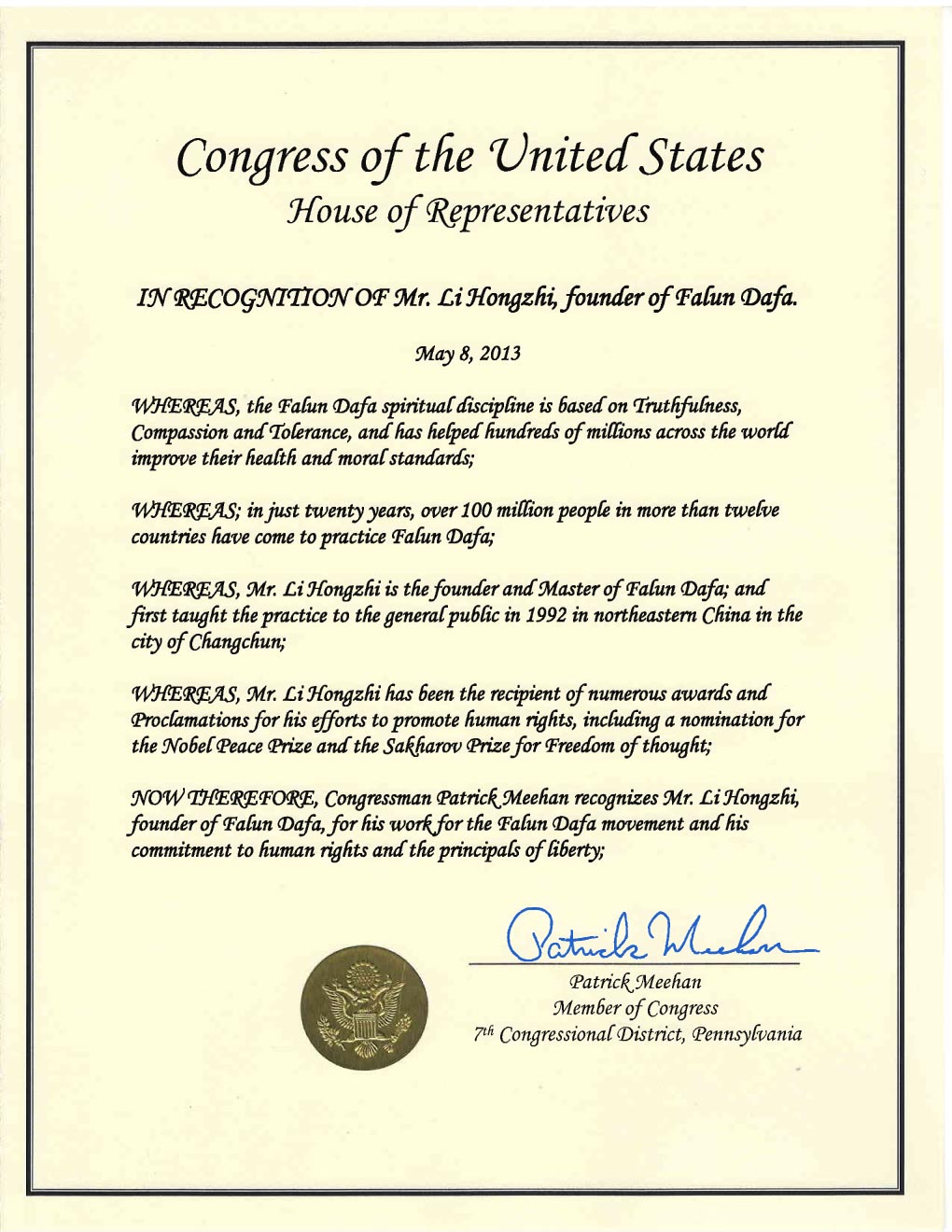 因此,聯邦眾議員帕特裏克•米漢褒獎法輪大法創始人李洪志先生,褒獎他對法輪大法的發展所做的貢獻,以及對人權和自由理念的承諾。