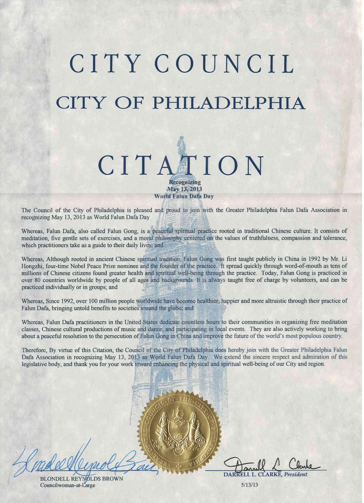 費城市議會高興又驕傲地與大費城法輪大法協會一起慶祝二零一三年五月十三日的世界法輪大法日。