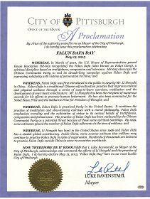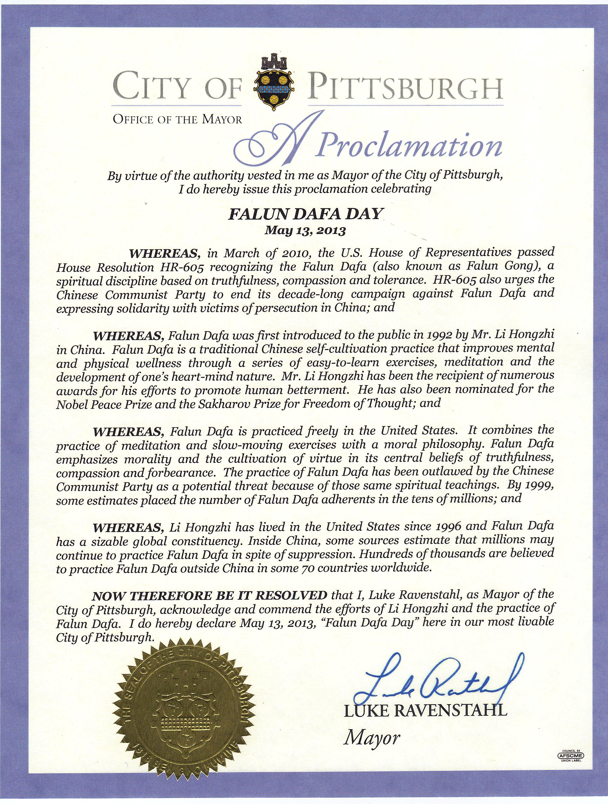 因此,我,盧克•瑞文斯朵(Luke Ravenstahl),以匹茲堡市市長的名義感謝和表彰李洪志先生及法輪大法修煉。我宣布二零一三年五月十三日為我們最宜居的匹茲堡市的「法輪大法日」。