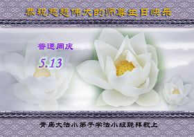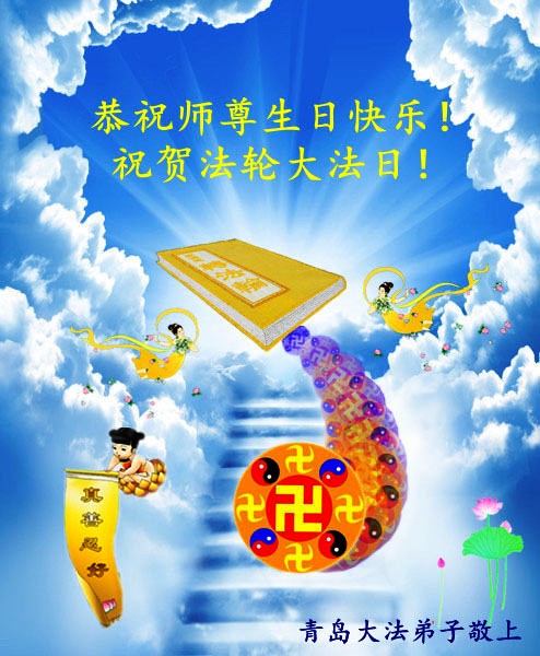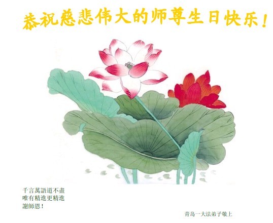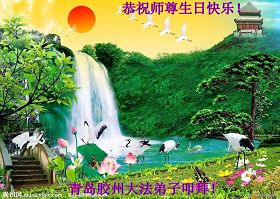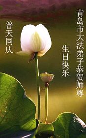 山東省青島市市南區大法弟子祝慈悲偉大的師尊生日快樂!我們向師尊保證,今後一定精進,配合整體,踏踏實實的做好三件事,唯願師尊欣慰。