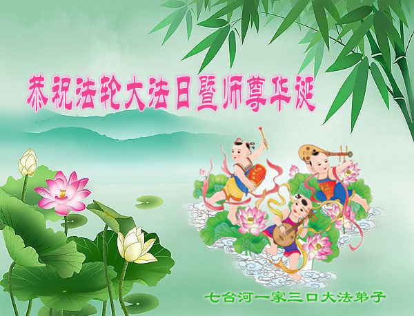 黑龍江省七台河一家三口大法弟子恭賀師尊華誕暨世界法輪大法日!
