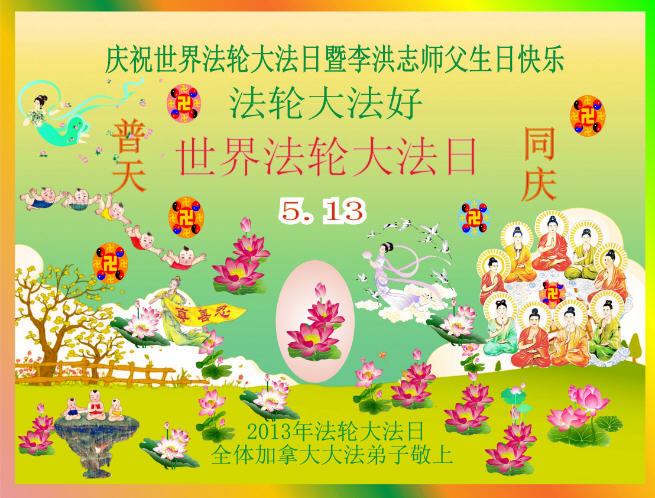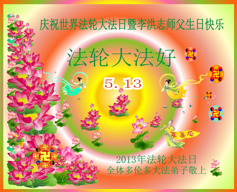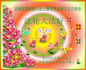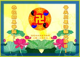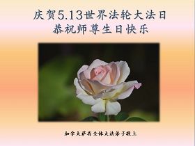 慈悲偉大的師父您好!在這普天同慶、同祝、同頌世界法輪大法日的日子裏,我們恭祝師尊生日快樂!並深深感恩師尊的慈悲苦度!在這最後剩下的不多時間裏,我們一定做好三件事,靜心學好法,遇事向內找,修去人心,同化宇宙「真善忍」特性,講清真相,多救人,兌現史前大願,不辜負師父的慈悲苦度。