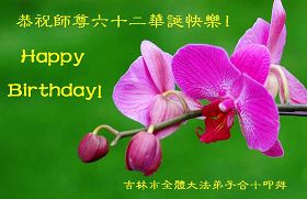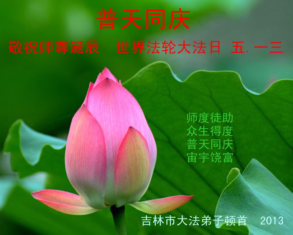 吉林省吉林市昌邑區一學法小組全體大法弟子,在5月13日即將到來之際,恭祝我們慈悲偉大的師尊生日快樂!請師尊放心,我們一定不辜負師尊的重託,堅定實修,履行我們史前的誓約,助師正法救度眾生。跪拜合十。