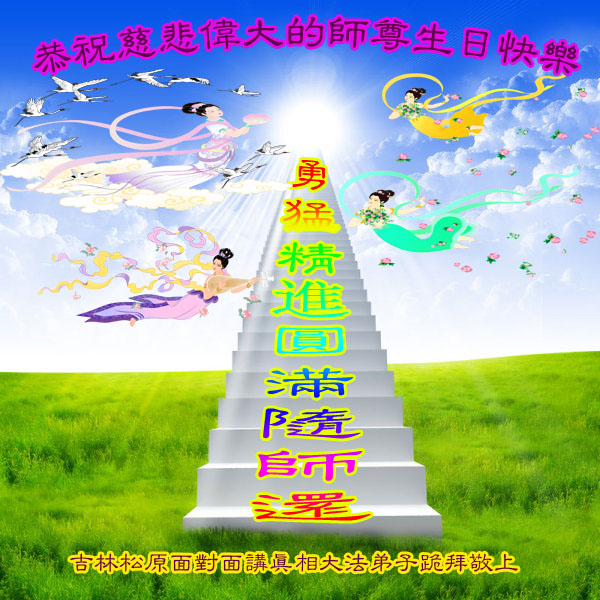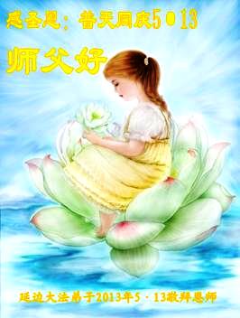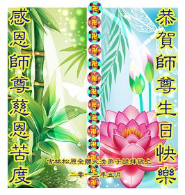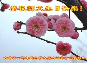 我和父親都是大法弟子,但我們遠隔千里,但我相信在師尊生日即將到來之際,他一定想向師尊祝福。我代父親向慈悲、偉大的師尊說一聲:師尊您辛苦了,師尊您生日快樂。我們會緊跟您走到最後,完成自己的史前大願。叩拜師尊。