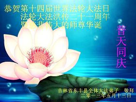 吉林省遼源市東豐縣全體大法弟子恭賀第十四屆世界法輪大法日暨法輪大法洪傳二十一週年!恭祝師尊華誕!
