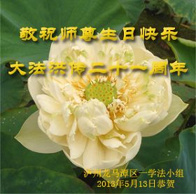 五月十三日,是恩師的生日,四川金堂縣一學法小組的全體大法弟子感謝師父的慈悲苦度,恭祝師父生日快樂!我們一定聽師父的話,做好三件事,圓滿隨師還!