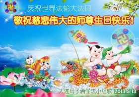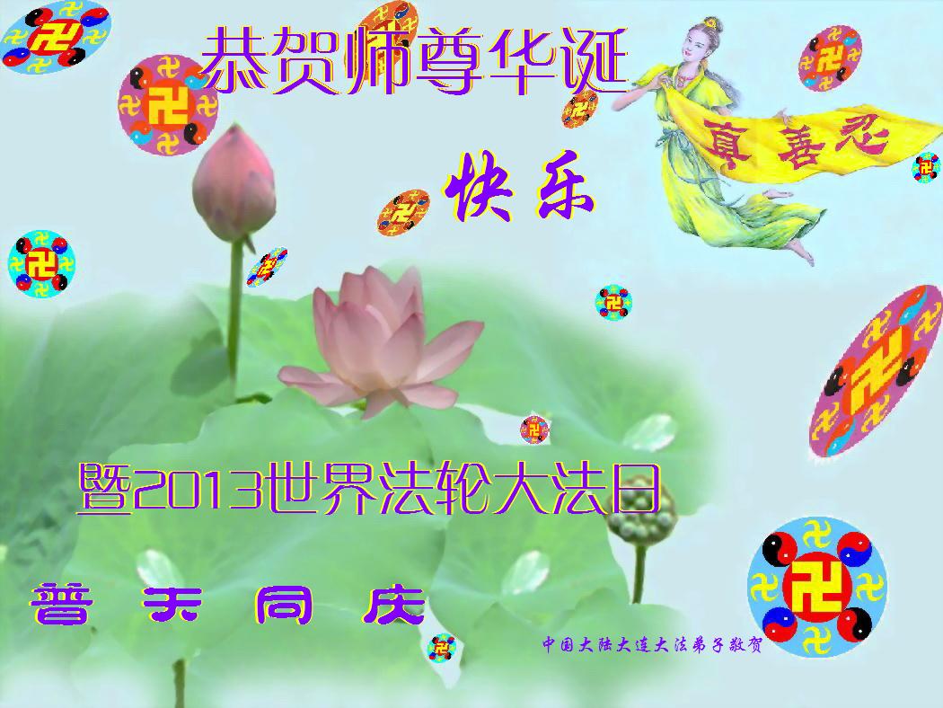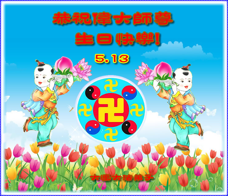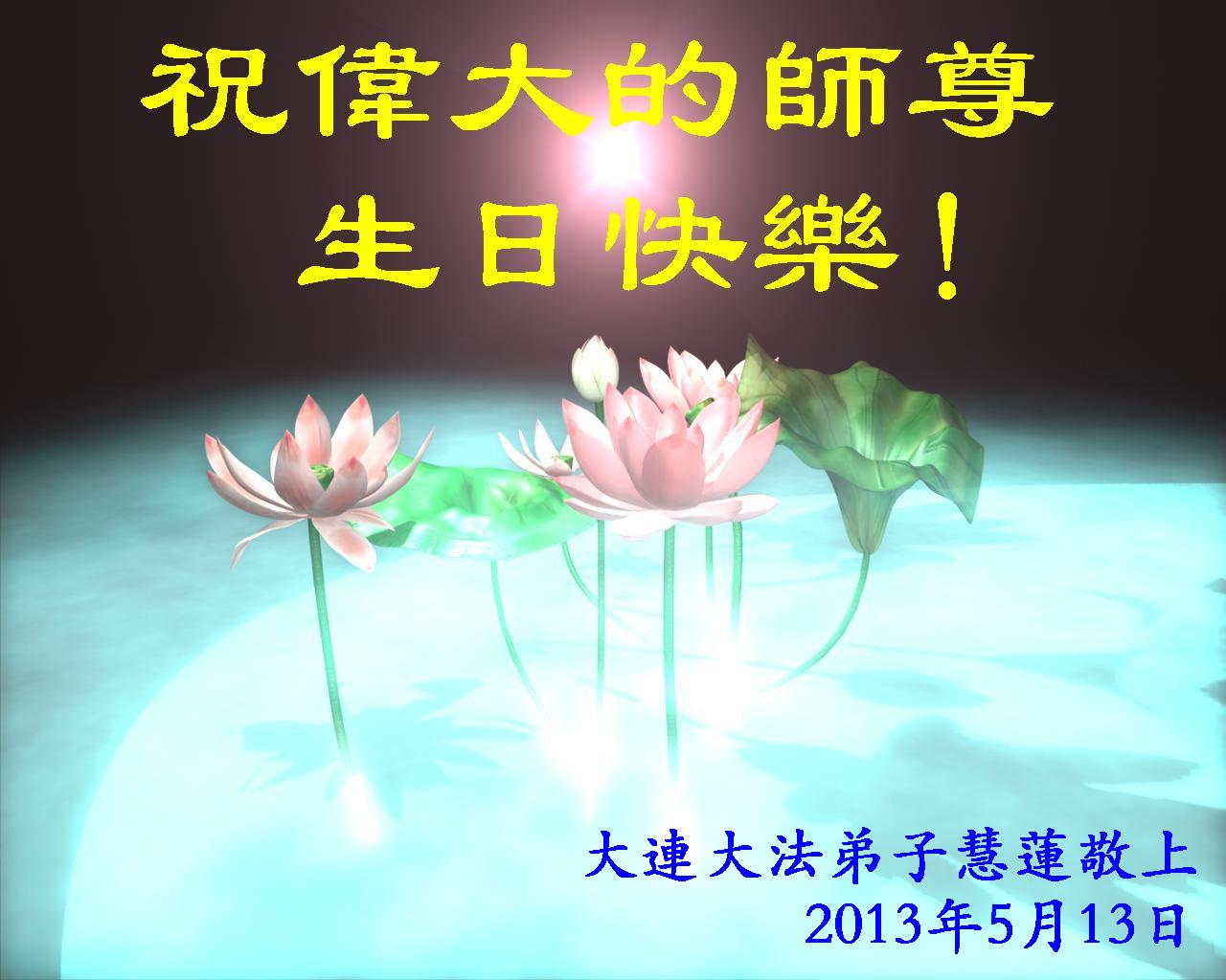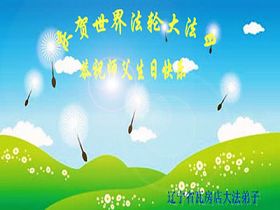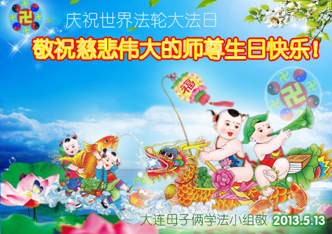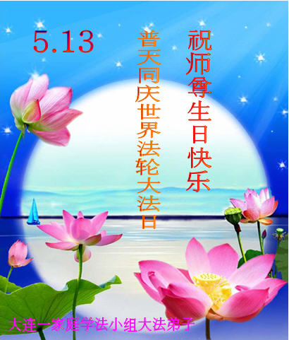 偉大慈悲的師尊,您好!一年一度的世界法輪大法日又一次降臨,師父二十一年的慈悲救度了宇宙大穹,救度了世界,救度了一切!弟子時刻沐浴在師尊的法光中,無法用語言表達對師尊的感恩。在這天人共慶的偉大時刻,藉著小小賀卡,大連大法弟子向師尊表達無限的感恩和思念,恭祝偉大慈悲的師尊生日快樂!