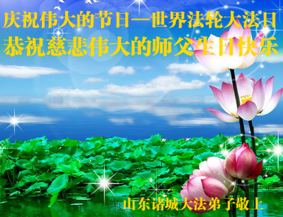 諸城一學法小組的大法弟子,與全世界的大法弟子一起,共同慶祝法輪大法洪傳二十一週年,歡慶大法日,祝慈悲的師父生日快樂!我們千言萬語難以表達對師父的感恩,我們想念師父,每天按著師父的要求做好三件事,我們期盼著跟隨師父回真正的家園。