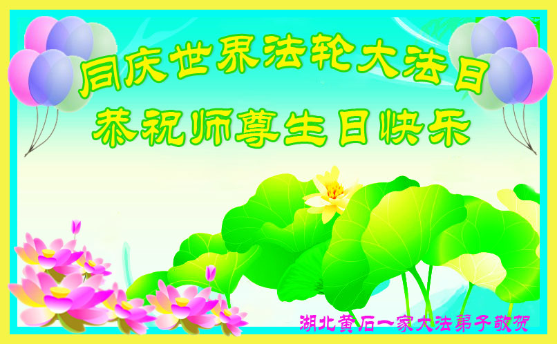 湖北黃石一大法弟子全家同慶同賀世界法輪大法日,恭祝師父生日快樂!