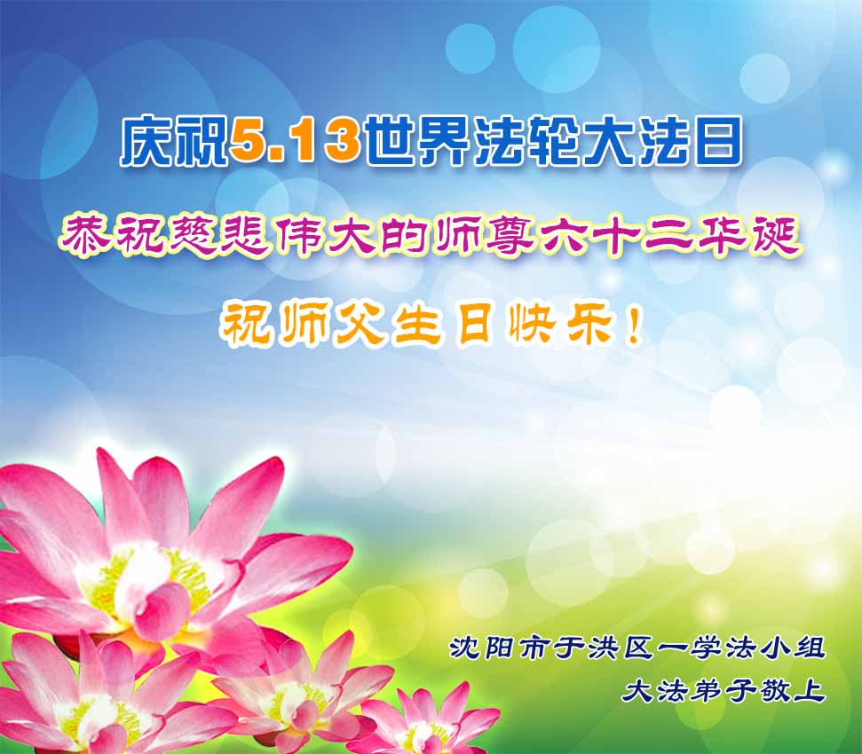 遼寧省瀋陽市於洪區一學法小組恭祝師父生日快樂!普天同慶世界法輪大法日!