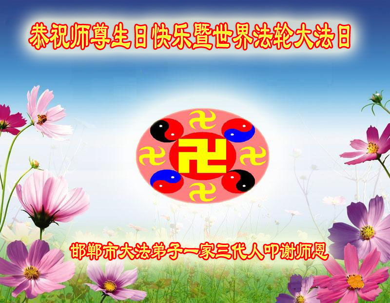 河北省邯鄲大法弟子一家三代恭祝師尊生日快樂!恭賀世界法輪大法日!