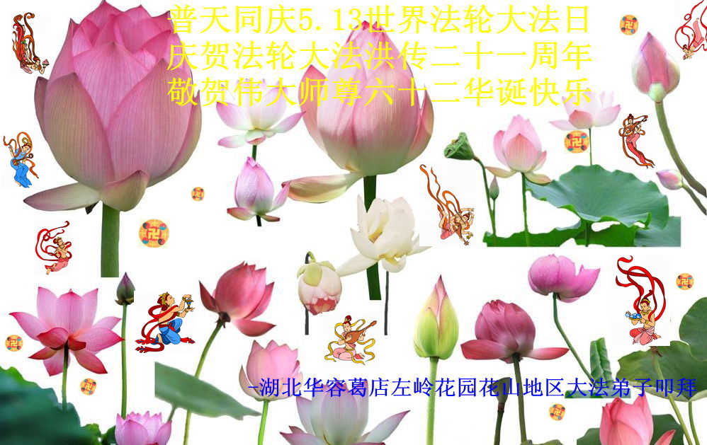 湖北省華容葛店左嶺花園花山地區全體大法弟子恭祝慈悲偉大的師尊生日快樂,同慶5.13世界法輪大法日!