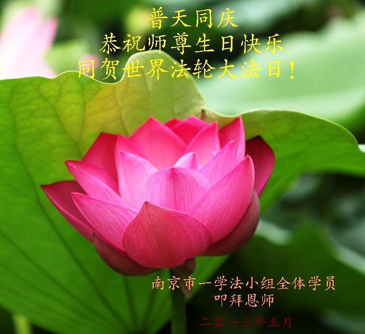 在這普天同慶的大喜日子裏,南京市白下區一學法小組全體學員:恭祝師尊生日快樂!同賀世界法輪大法日!我們一定在師父正法的最後時刻,學好法,修好自己,努力做好三件事,跟師父回家。