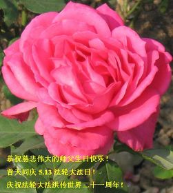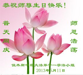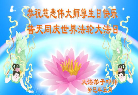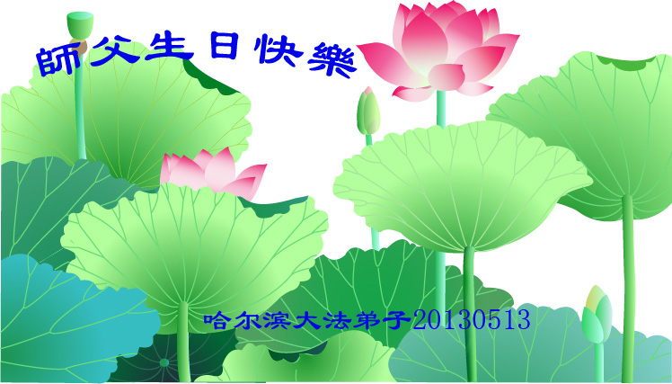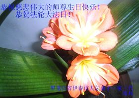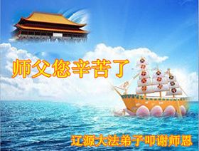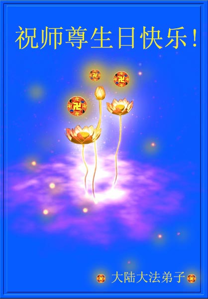 我們一家有四人是大法弟子,還在校的一雙兒女也信師信法,我們全家在這裏向慈悲偉大的師尊叩拜!恭祝師尊生日快樂!感恩師尊的慈悲苦度!弟子們牢記師尊教誨:「修得執著無一漏,苦去甘來是真福」,實修做好三件事,圓滿隨師還。