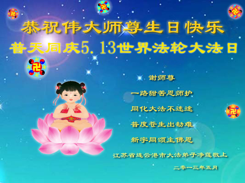 江蘇省連雲港市大法弟子恭祝師尊生日快樂!普天同慶5•13世界法輪大法日!慶祝大法洪傳二十一週年!