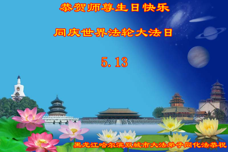 黑龍江哈爾濱雙城市大法弟子恭祝慈悲偉大的師尊生日快樂!慶賀5•13世界法輪大法日!大法洪傳二十一週年!