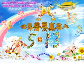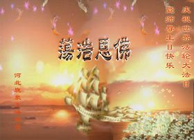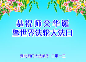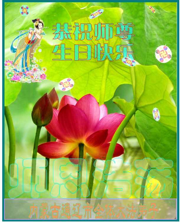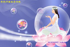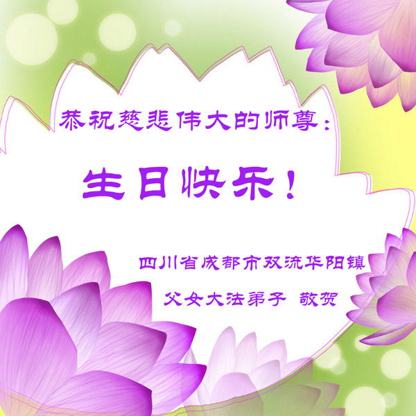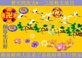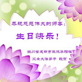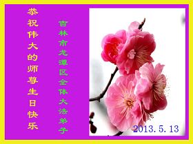 我是江蘇連雲港的大法弟子,去年回來的,被綁架了7年,我現在一直狀態不好,想想回來1年了,一直不能精進,很對不起師父的這麼多年的呵護。在這裏祝師父生日快樂!我一定努力趕上。謝謝師父。