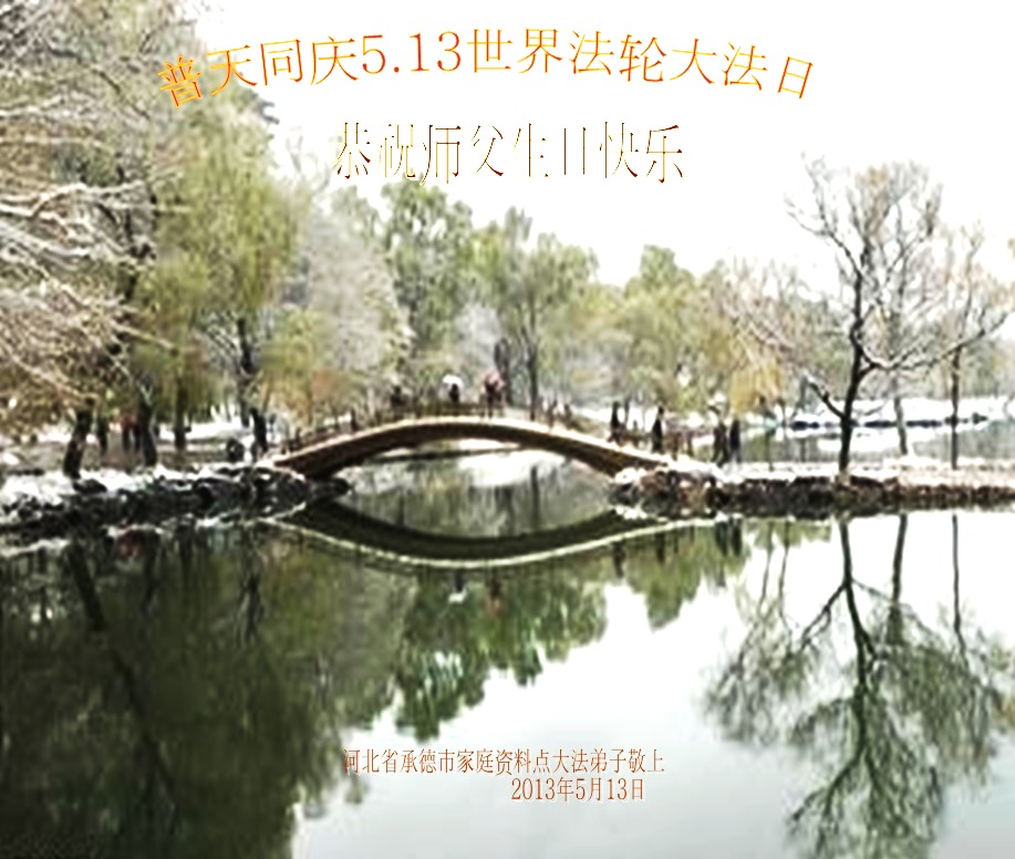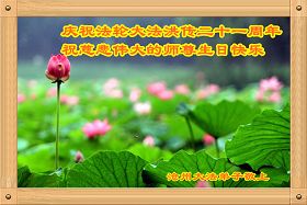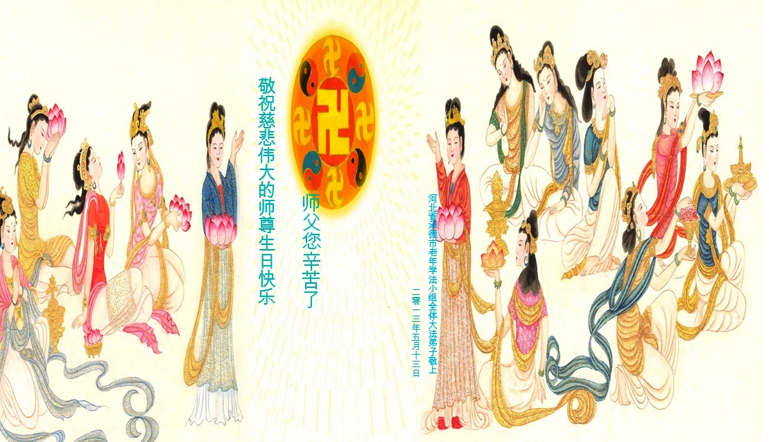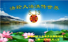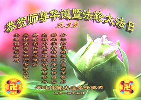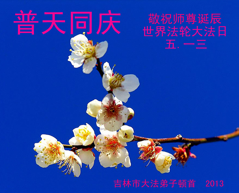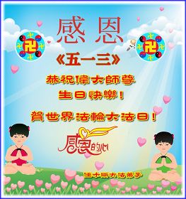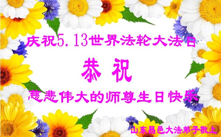 慶祝法輪大法日恭祝師尊生日快樂!值此「513」偉大時日來臨之際,弟子感恩師尊對宇宙眾生無量的慈悲與救度。正因為師尊的佛光普照,才有了宇宙眾生生生不息的今天,才有了弟子於世間助師正法的神聖機緣,才有了弟子正法時期大法弟子的偉大稱號,弟子要珍惜,精進實修,踏踏實實的走好最後的路,成就新宇宙的覺者,以慰師尊。