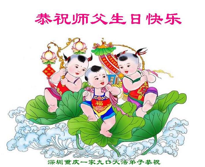 深圳重慶一家九個大法弟子恭祝師父生日快樂!