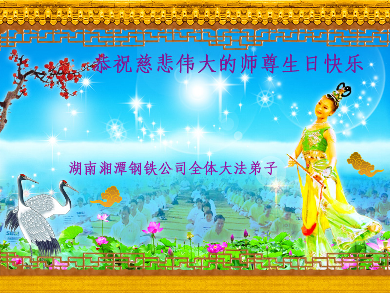 湖南湘潭鋼鐵公司全體大法弟子恭祝慈悲偉大的師尊生日快樂!