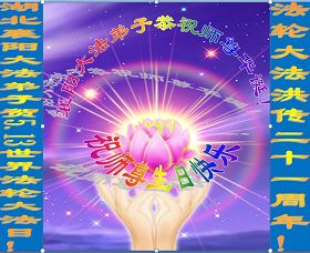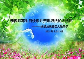 在這春暖花開的季節,我們又迎來了五月十三日這普天同慶的偉大節日,在此我們恭祝師尊生日快樂!祝賀師尊傳法二十一週年和世界法輪大法日!在正法的最後時刻我們要努力做好師尊要求的三件事,正念正行,多救人,做合格的大法弟子!