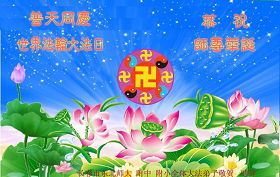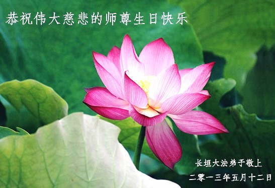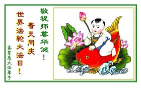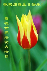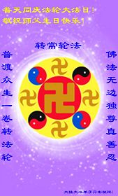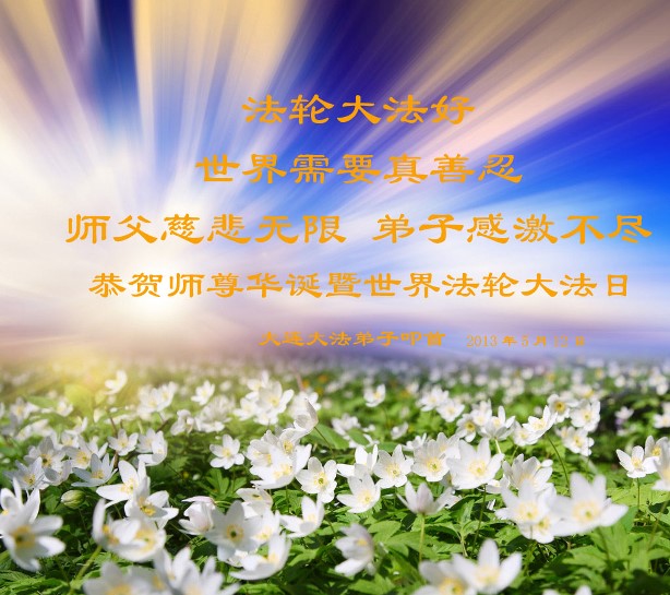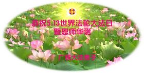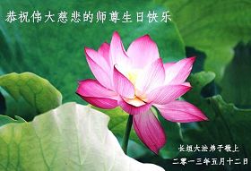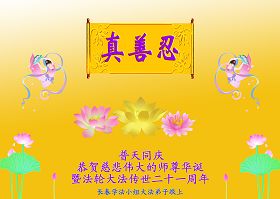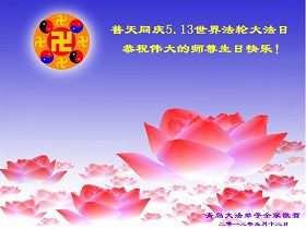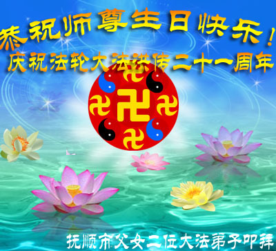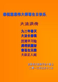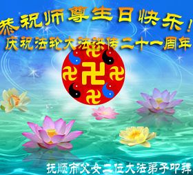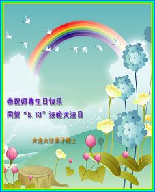 謹此代表我和媽媽同修恭祝最偉大的師尊生日快樂!並祝賀法輪大法洪傳世界二十一年,風雨過後就是彩虹,我們期盼跟師父回家的那一天。