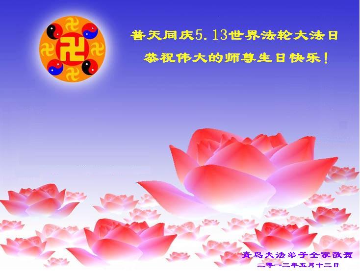 青島大法弟子全家慶祝世界法輪大法日!恭祝師父生日快樂!