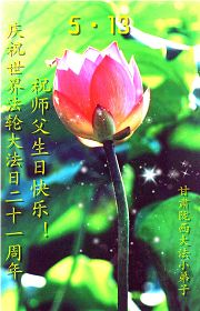 師尊您好!大法洪傳已二十一年了,曾經的大法小弟子也已長大。弟子是在修煉大法、證實大法中長大的,講真相、救世人的過程中,我還做的不夠,很慚愧,但弟子堅定的在大法中,從未動搖!對大法堅定的信念,從未改變!弟子會更加努力,跟上師父的正法進程,在所剩不多的時間裏,抓緊救度被邪黨矇蔽了的眾生。感恩師尊的慈悲苦度!師恩浩蕩,佛法無邊!
