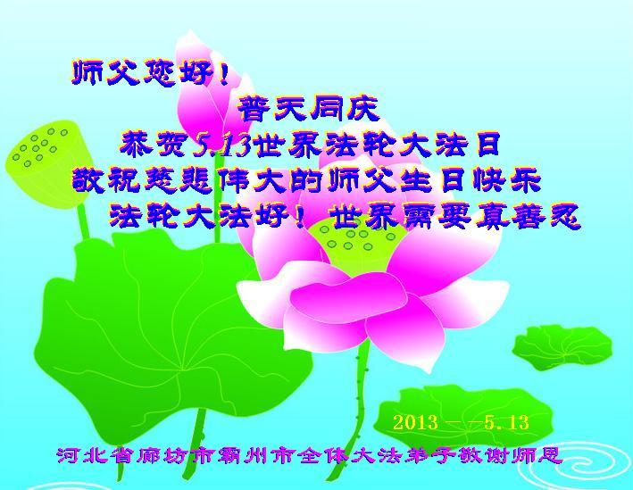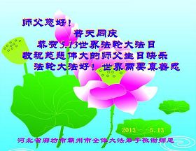 河北省霸州市全體大法弟子恭祝師尊華誕!賀法輪大法洪傳世界!普天同慶「世界法輪大法日」!