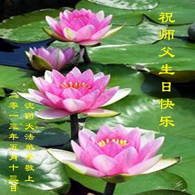 偉大的師父您好!我們在東北遙祝師父生日快樂!我們小組在師父的慈悲看護下已經走過了七個年頭。我們深知我們的歷史責任,我們一定會多學法,用心悟,努力實修,把我們目前做的項目做好。我們知道,我們還有許多人心,有待儘快修去。我們還有許多配合的不到位的地方,有待進一步協調好。我們一定努力做好,同修之間互相包容,互相謙讓,在法上形成堅強的整體。快救人,多救人,走正走好今後的助師正法的路!叩拜師父!