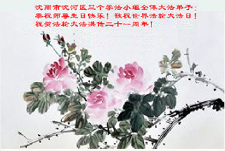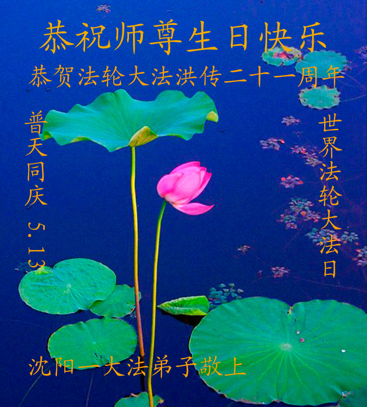 我們瀋陽市於洪區一學法小組全體大法弟子懷著感恩、激動的心情,恭祝師父生日快樂!慶祝法輪大法洪傳二十一週年!我們會更加精進,做好三件事,不辜負師父對我們的慈悲苦度,隨師回家!