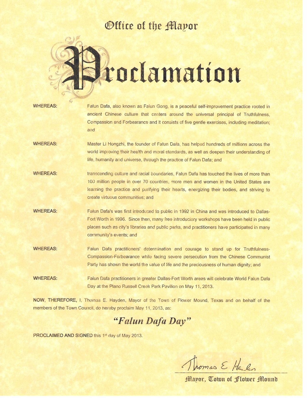鑑此,我,托馬斯﹒海頓(Thomas E. Hayden),花崗市(Town of Flower Mound)市長,並代表市議會,宣布二零一三年五月十一日為