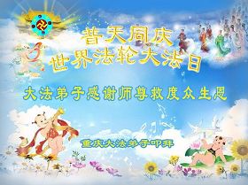 我們向偉大的師尊表示我們深深的無以言表的謝意!是師尊賜予我們無上的榮耀──助師正法,救度眾生;是師尊把我們從污泥中撈起,洗淨,賦予新生;是師尊將我們從即將淘汰的舊宇宙度化到永世長存的新大穹;是師尊為我們的幸福美好嘔心瀝血,承受罪業。我們決不辜負師尊的希望,惟有精進實修,辛苦做好三件事,功成圓滿,無愧於「正法時期大法弟子」的稱號,以謝師恩。