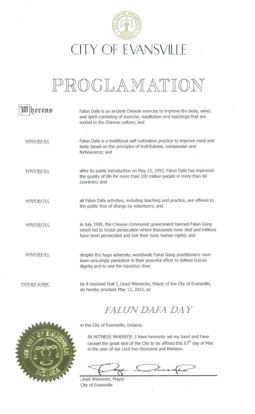 鑑此,我,印第安納州埃文斯維爾市市長勞埃德﹒溫內克,特此宣告二零一三年五月十三日為印第安納州埃文斯維爾市