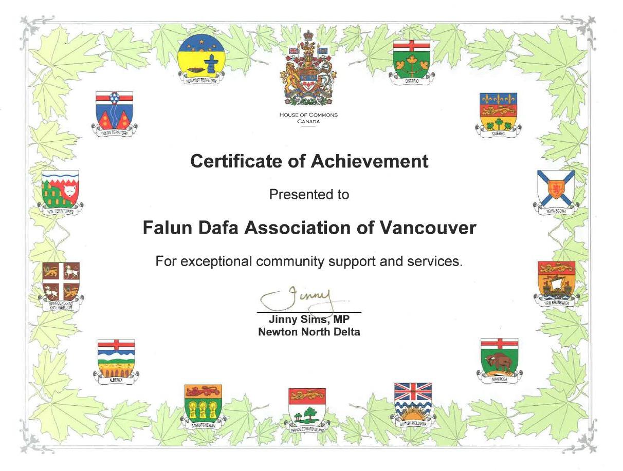 ![]() 國會議員辛綺麗嘉獎溫哥華法輪大法學會 |