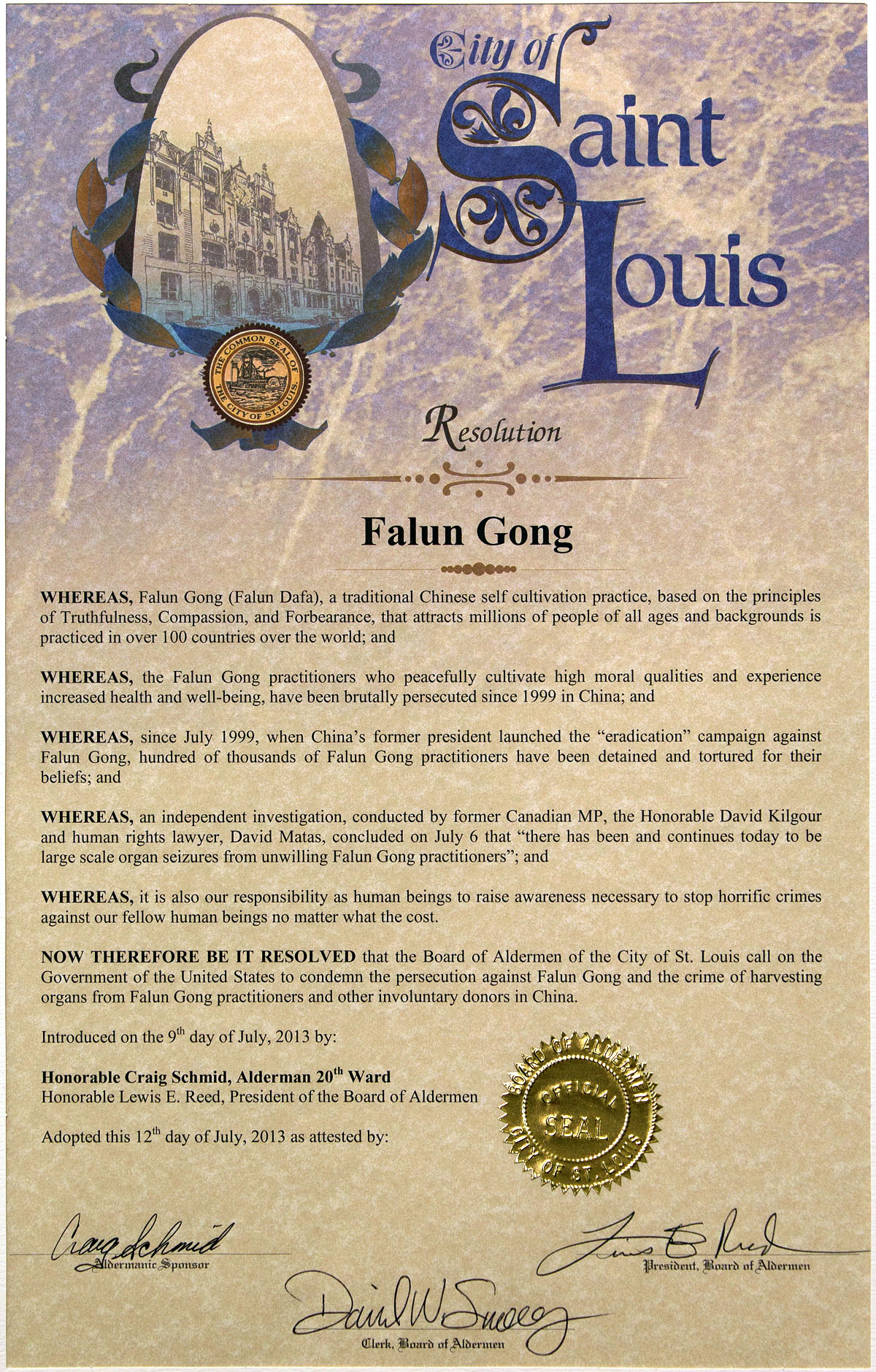 【明慧網二零一三年七月十五日】二零一三年七月十二日,美國密蘇裏州聖路易市議會通過決議,譴責中共迫害法輪功以及活體摘取法輪功學員器官的罪行。