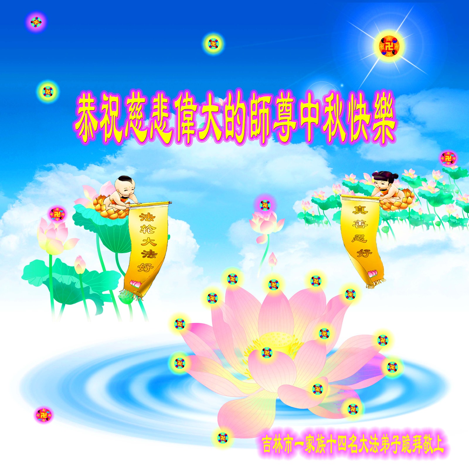 吉林市一家十四名大法弟子恭祝慈悲偉大的師尊中秋節快樂!