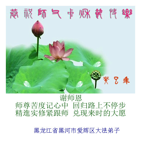 幸遇救命的佛家「法輪佛法」,拜謝師尊慈悲救度弟子全家得法;純正一念進師門。講真相、反迫害、救世人已過十四秋,弟子做好三件事,無悔無我救眾生。天地良知在人心。人有善心神佛佑。佛光普照施甘霖,天清體透謝師恩。