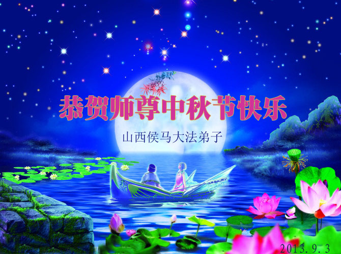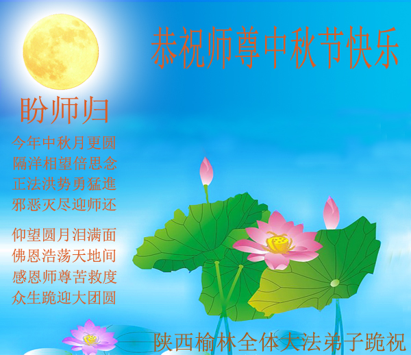 明月高懸,世人團聚之中秋,大陸弟子期盼師尊早日歸來,師徒慶團圓。恩師慈悲苦度,弟子感激萬千,沐浴在浩蕩的佛光裏,弟子全家無比幸福、安康,感謝明慧提供一個美好的網絡,獻給師尊中秋的祝福。