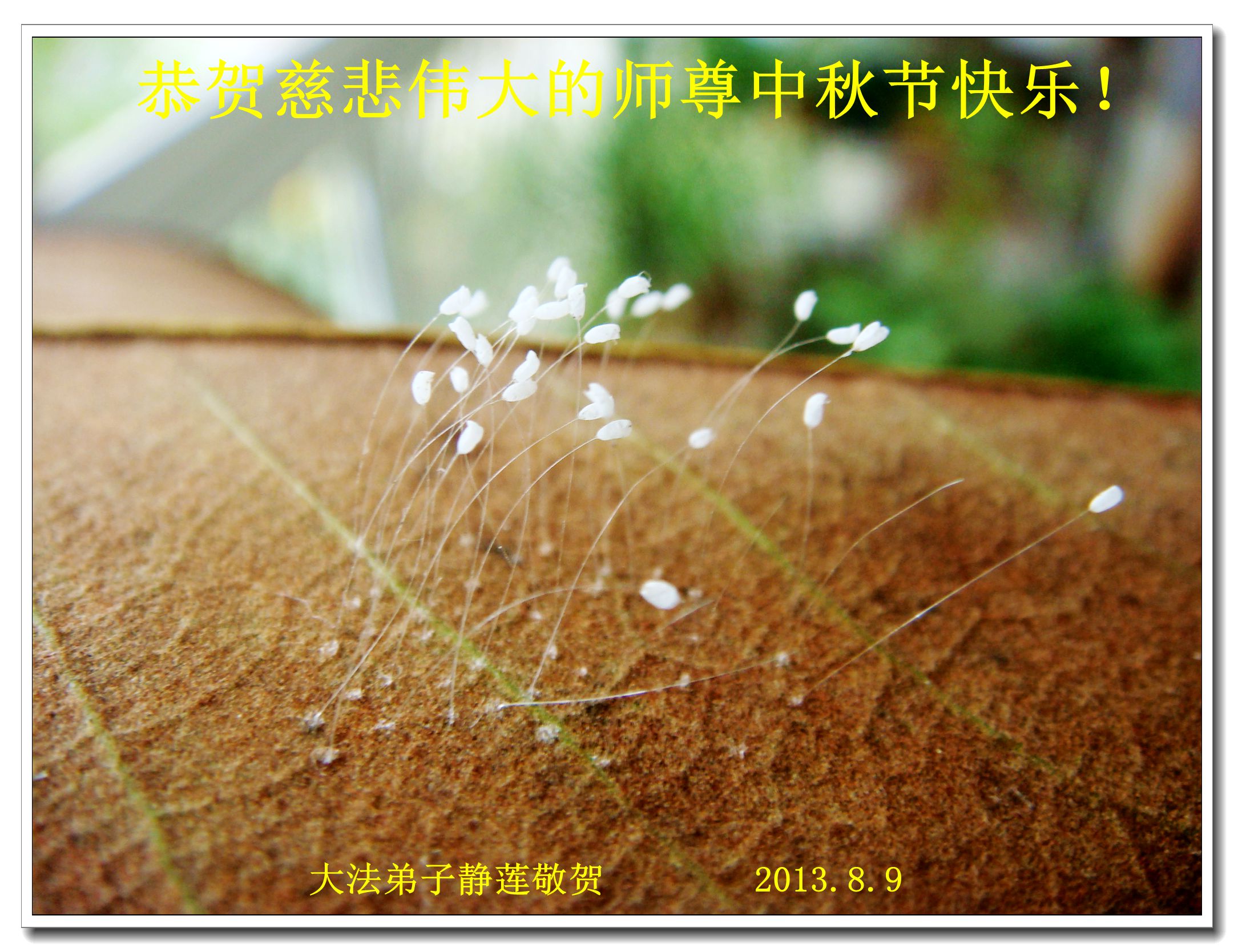 師尊您好!值中秋佳節來臨之際,弟子在遙遠的大陸叩拜師尊中秋節快樂!感謝您的慈悲,讓弟子有幸得到了三千年一開的優曇婆羅花,從去年五月至今一直在我家珍藏。共有三十朵,生長在一片樹葉上,樹葉早已乾枯,婆羅花卻依然盛開。弟子將此花獻給您,感謝您對弟子的慈悲救度,也想讓更多的世人看到這罕見的奇花,快來尋找救人的大法和救人的真相,掙脫中共邪黨的枷鎖,危難來時得到神佛的護佑!
